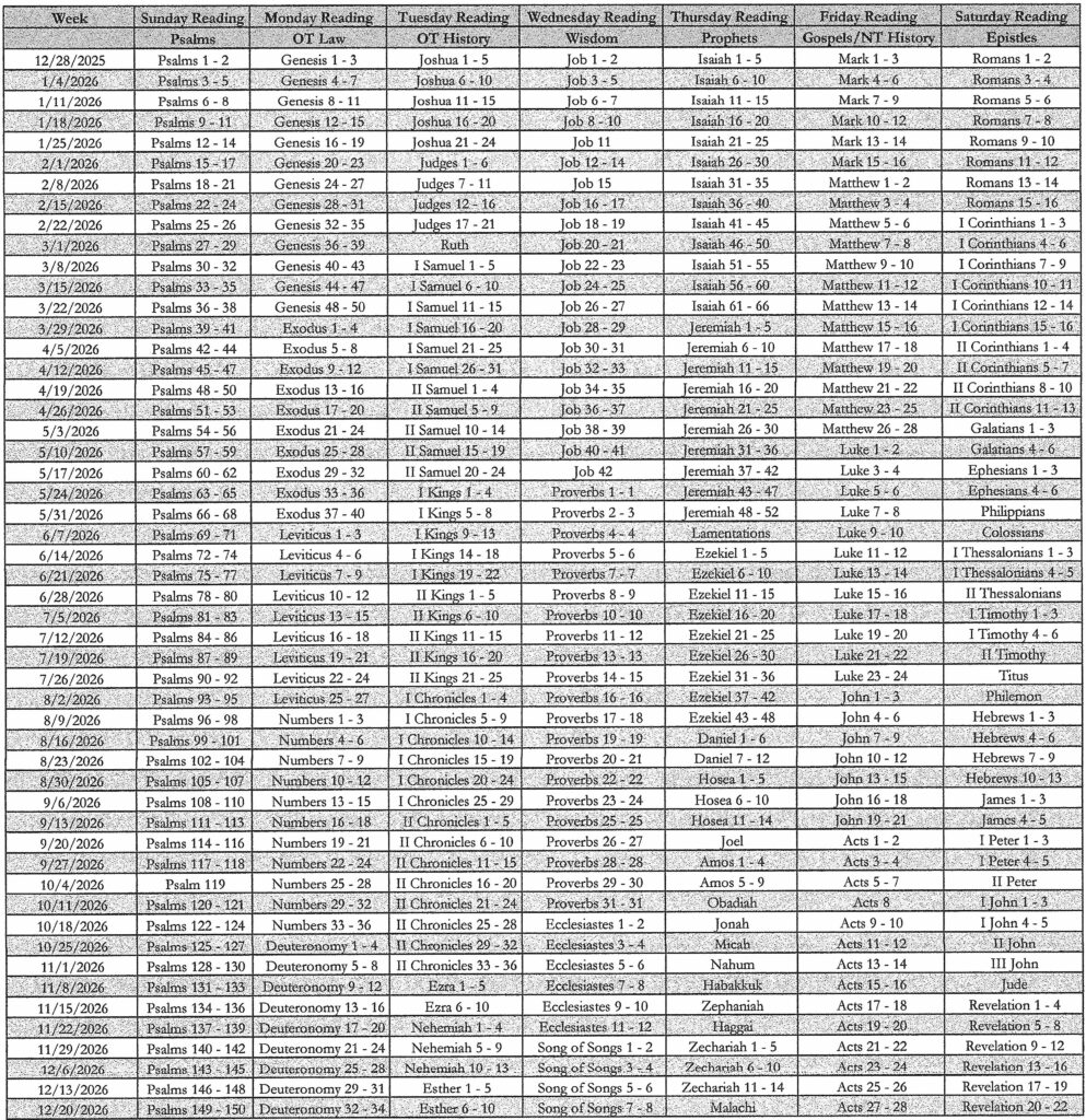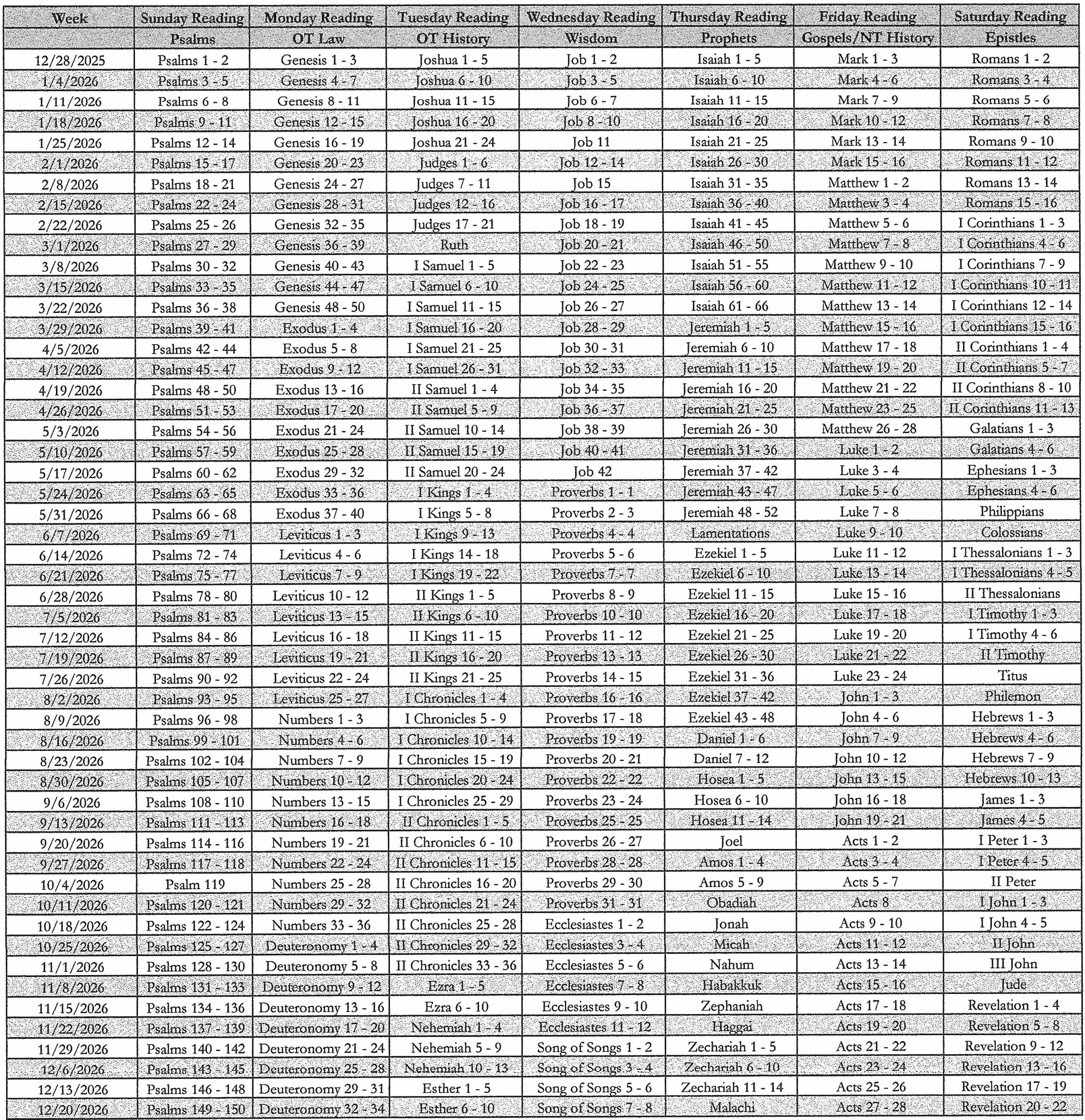 As the new year begins, most Bible reading plans start over. Our plan is no different, other than the fact that it’s already started! Since we have a 52 week plan, it doesn’t coincide exactly with the new year changeover. But now is still a good time to start – you’re only three easy days behind.